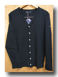 ベーシックなカラー、7つ並んだボタンと浅めのVネックの開きは、