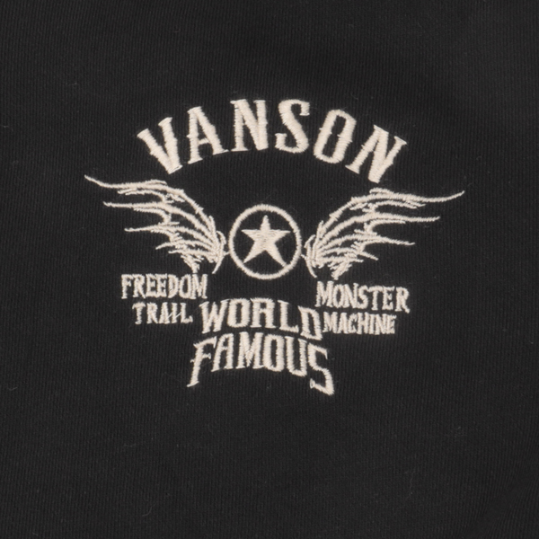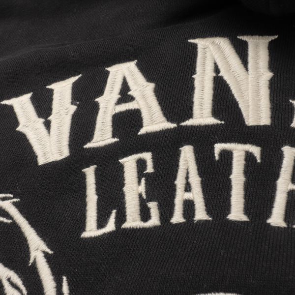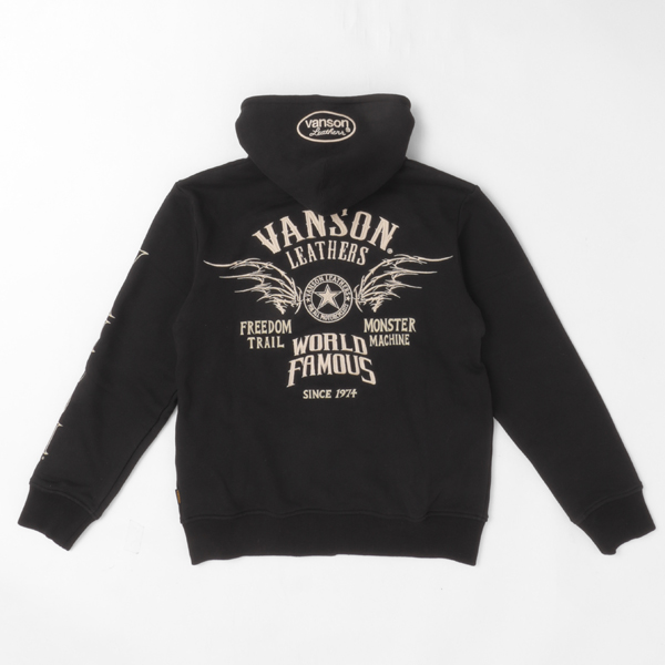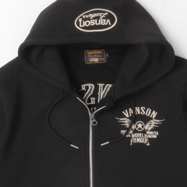 コットン100%の裏毛スウェットを使用したフルジップパーカー。 VANSONらしい刺繍デザインが映える、アメカジ・バイカースタイルに最適な一着です。