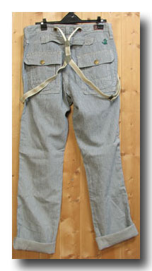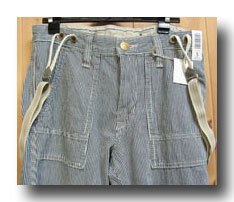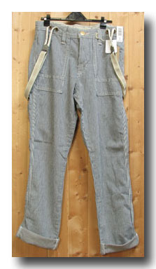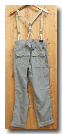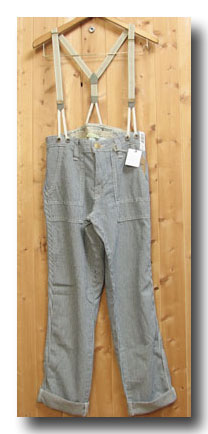 Lady EDWIN People At Wolk KL1106 完売 サスペンダ^ワークパンツ 104)ヒッコリー 綿88% 麻12% 牛皮 ラベル XS,S,M 日本製 本体価格=¥9.500- +税