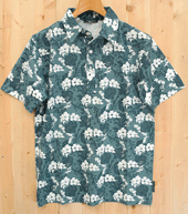 粗野感のあるスラブ素材に花のモチーフを全面にプリントしたポロシャツ