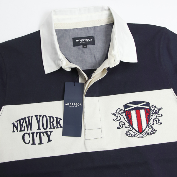 ラガーシャツ必須の衿は、コットン綿布素材、前立ては、隠しゴムボタン仕様! 胸には、マクレガーロゴ刺繍とエンブレムアワッペン!