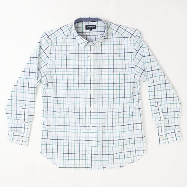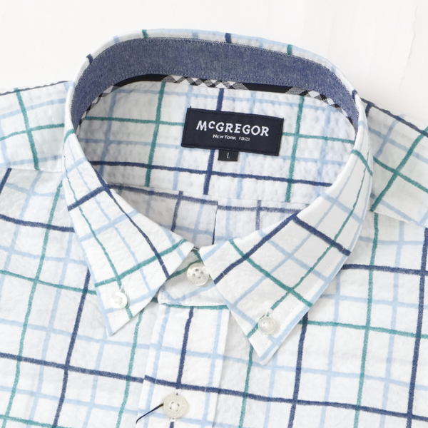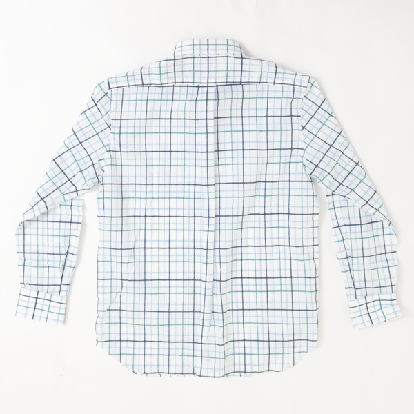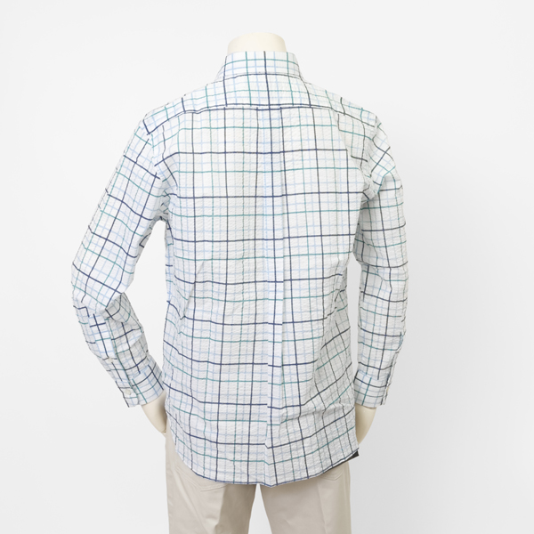 多色使いのタッターソールチェックを清涼感のある素材にプリントした個性的な夏長袖シャツ。 ボタンダウン襟デザイン。 凹凸のあるリップル素材に手書き風のプリントで表現した多色使いのタッターソールチェックをプリント。 大人の遊び心のあるスタイリングのアクセントに最適です。