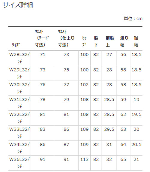 | ウエスト内周 | 78 | 79 | 82 | 84 | 86 | 89 | 91 | 96 |