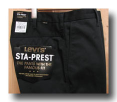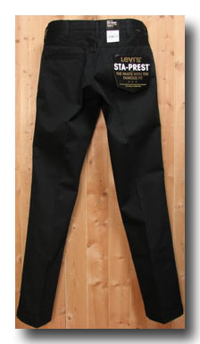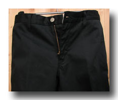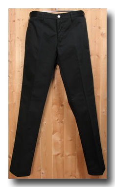 完売御礼 −−−→ファイブポケットタイプは、こちら サイドポケット仕様 9.5ozコーティングツイル 綿35% ポリエステル65% パーマネント プレス加工 フロントラインが洗っても取れません。 21)ブラック サイズ=28.30..32.34インチ 股下=83cm \11.550-税込み 本体価格=\11.000-