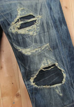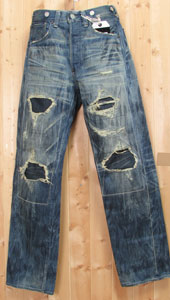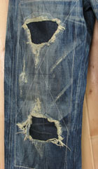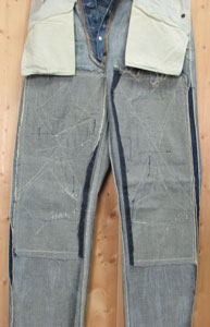 腿からヒザにかけてクラッシュユーズドさせるとともに、内側から補強布施したカスタマイズビンテージモデル