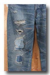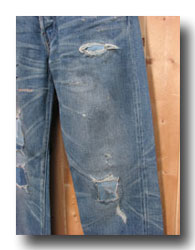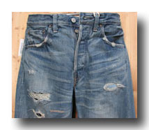 完売御礼 45)フレイドドライ クラッシュアンドリメイク加工仕様 サイズ=31.32.34.36 税込み価格=\37.800 本体価格=\36.000-- 14oz Denim 両面BIG E タブ 、ビンテージデニム100% /セルビッチ仕様 /センター外し/焼きいれ純銅リベット/セルヴィッチ