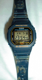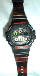 DW−5600D−1 はじめの一本から、2ヶ月後、あるスポーツ用品店のお兄さんが はめているのを見て、欲しい!もらいたい!譲って欲しい! と思い込んだほどのモデルです。 私にとっての幻の一本。 これを探しているうちに、なーンと G−SHOCKERになってしまったという忘れられないモデル なのです。 G−SHOCK攻略本でアキバのカシオショップにまだあったのには ビックリ!、95年12月頃行った時には5600B−3Vが店頭に 並んでいたけど、あの時おくの方にあったと思うととても悔しいの でした。 たぶん、初代迷彩の中では、一番マーブルです。 |